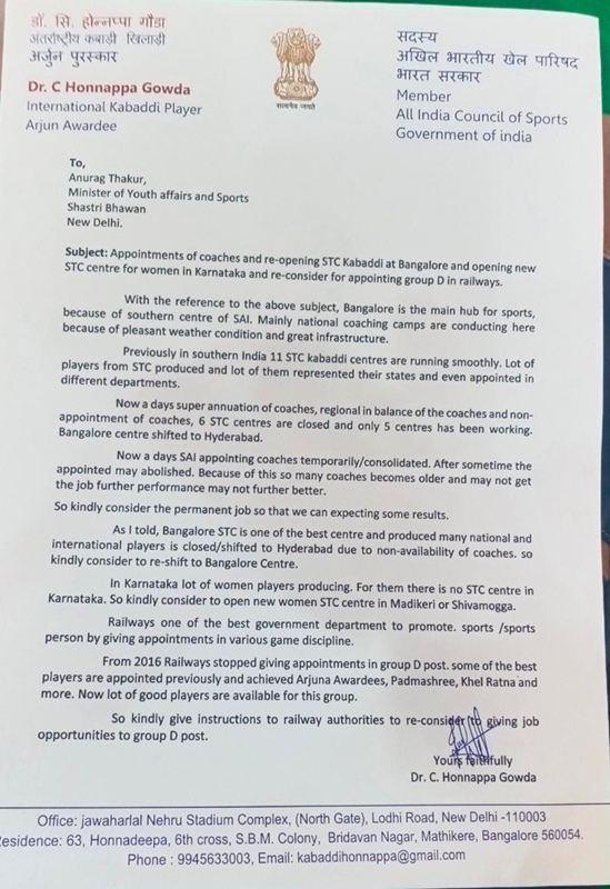 ಬೆಂಗಳೂರು: ಉದ್ಯಾನನಗರಿಯ ಬೆಂಗಳೂರಿನಲ್ಲಿ ಎಸ್ಟಿಸಿ ಕಬಡ್ಡಿ ಕೇಂದ್ರವನ್ನು ವಾಪಸ್ ಆರಂಭಿಸಬೇಕು, ಮಹಿಳೆಯರಿಗಾಗಿಯೇ ರಾಜ್ಯದಲ್ಲಿ ಪ್ರತ್ಯೇಕ ಭಾರತೀಯ ಕ್ರೀಡಾ ಪ್ರಾಧಿಕಾರ (ಸಾಯ್) ಕೇಂದ್ರ ತೆರೆಯಬೇಕು, ಸಾಯ್ ಕೋಚ್ ಗಳಿಗೆ ಉದ್ಯೋಗ ಭದ್ರತೆ ಕಲ್ಪಿಸಬೇಕು ಸೇರಿದಂತೆ ವಿವಿಧ ಬೇಡಿಕೆಗಳನ್ನು ಈಡೇರಿಸುವಂತೆ ಕೇಂದ್ರ ಕ್ರೀಡಾ ಸಚಿವ ಅನುರಾಗ್ ಠಾಕೂರ್ ಅವರಿಗೆ ಅರ್ಜುನ ಪ್ರಶಸ್ತಿ ವಿಜೇತ, ಹಿರಿಯ ಕಬಡ್ಡಿ ಪಟು ಹಾಗೂ ಹಾಲಿ ಭಾರತದ ಸರಕಾರದ ಆಲ್ ಇಂಡಿಯಾ ಸ್ಪೋರ್ಟ್ಸ್ ಕೌನ್ಸಿಲ್ ಸದಸ್ಯ ಹೊನ್ನಪ್ಪ ಗೌಡ ಮನವಿ ಮಾಡಿದ್ದಾರೆ.