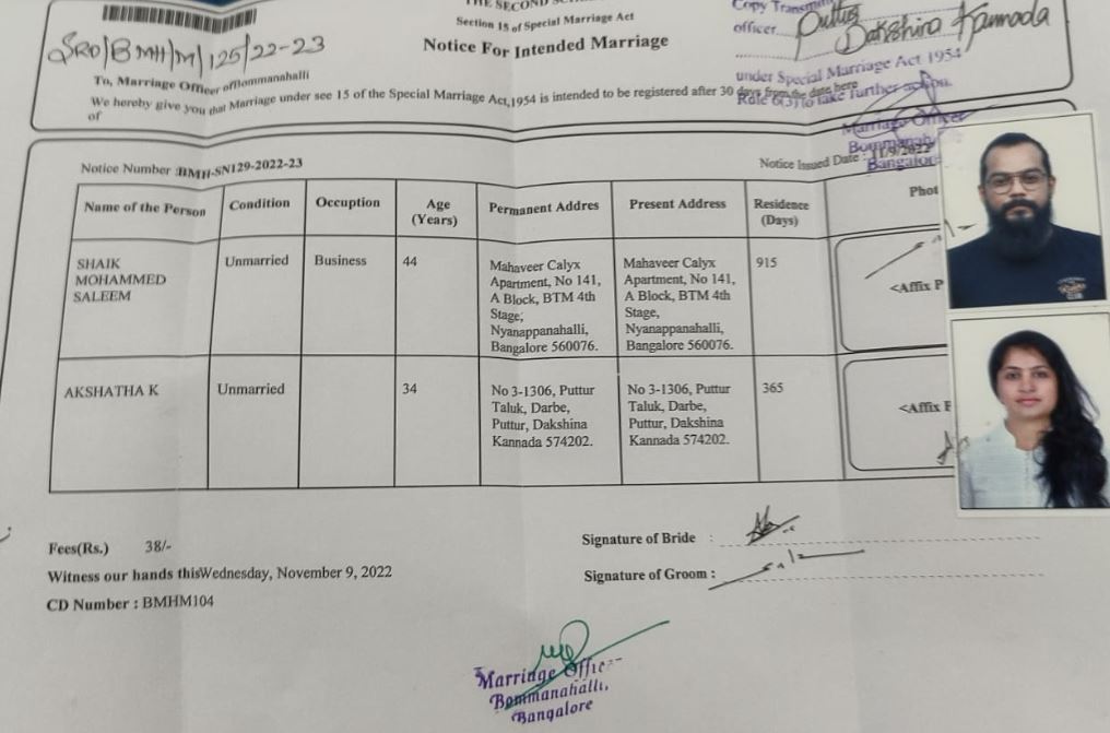 ಪುತ್ತೂರಿನ ದರ್ಬೆ ನಿವಾಸಿ ಅಕ್ಷತಾ (೩೪) ಎಂಬಾಕೆ ಬೆಂಗಳೂರಿನ ನ್ಯಾಣಪ್ಪನಹಳ್ಳಿ ಮಹಮ್ಮದ್ ಸಲೀಂ (೪೪) ನನ್ನು ನವೆಂಬರ್ ೯ ರಂದು ಮದುವೆಯಾಗಿದ್ದಾಳೆ. ಈ ಬಗ್ಗೆ ಬೊಮ್ಮನಹಳ್ಳಿ ರಿಜಿಸ್ಟ್ರಾರ್ ಕೇಂದ್ರದಲ್ಲಿ ವಿವಾಹ ನೋಂದಣಿಯಾಗಿದೆ. ಈ ನೋಟಿಸ್ ಸೋಷಿಯಲ್ ಮೀಡಿಯಾದಲ್ಲಿ ವೈರಲ್ ಆಗಿದ್ದು ವ್ಯಾಪಕ ವಿರೋಧ ವ್ಯಕ್ತವಾಗಿದೆ.
