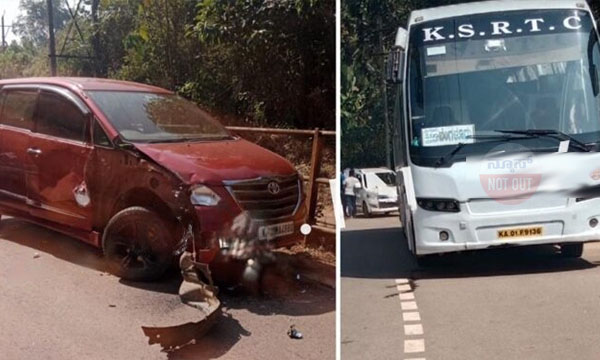 ಸುಳ್ಯ ಕಡೆಯಿಂದ ಪುತ್ತೂರು ಕಡೆಗೆ ಬರುತ್ತಿದ್ದ ಇನೋವಾ ಮತ್ತು ಪುತ್ತೂರು ಕಡೆಯಿಂದ ಸುಳ್ಯ ಮಾರ್ಗವಾಗಿ ಬೆಂಗಳೂರಿಗೆ ಹೋಗುತ್ತಿದ್ದ ಐರಾವತ ಬಸ್ ನಡುವೆ ಡಿಕ್ಕಿ ಸಂಭವಿಸಿದೆ. ಘಟನೆಯಲ್ಲಿ ಕಾರಿನ ಮುಂಭಾಗ ನಜ್ಜುಗುಜ್ಜಾಗಿದ್ದು, ಅದೃಷ್ಟವಶಾತ್ ಕಾರಿನಲ್ಲಿದ್ದ ಪ್ರಯಾಣಿಕರು ಅಪಾಯದಿಂದ ಪಾರಾಗಿದ್ದಾರೆ.