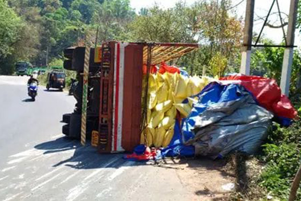 ಮಂಗಳೂರುನಿಂದ ಪೊನ್ನಂಪೇಟೆ ತಾಲೂಕಿನ ಹುದಿಕೇರಿಗೆ ಲಾರಿಯಲ್ಲಿ ಪೂರ್ತಿ ಗೊಬ್ಬರ ಸಾಗಿಸಲಾಗುತ್ತಿತ್ತು. ಈ ವೇಳೆ ಮೇಕೇರಿ ಮಸೀದಿ ಬಳಿಯ ಇಳಿಜಾರು ರಸ್ತೆಯಲ್ಲಿ ನಿಯಂತ್ರಣ ಕಳೆದುಕೊಂಡ ಲಾರಿ ರಸ್ತೆ ಬದಿಗೆ ಮಗುಚಿ ಬಿದ್ದು, ಗೊಬ್ಬರ ಚೀಲಗಳು ಚೆಲ್ಲಾಪಿಲ್ಲಿಯಾಗಿ ಹರಡಿಕೊಂಡಿವೆ. ಕೆಲವು ಗೊಬ್ಬರದ ಚೀಲಗಳಿಗೆ ಹಾನಿಯಾಗಿವೆ.