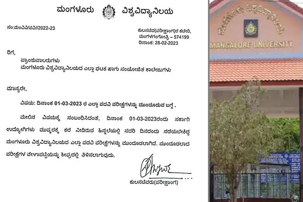 ಈ ಹಿನ್ನೆಲೆಯಲ್ಲಿ ಪ್ರಕಟಣೆ ಹೊರಡಿಸಿರುವ ವಿವಿಯ ಕುಲಸಚಿವರು ಮಾ.1ರಂದು ಸರಕಾರಿ ಉದ್ಯೋಗಿಗಳು ಮುಷ್ಕರಕ್ಕೆ ಕರೆ ನೀಡಿರುವ ಹಿನ್ನೆಲೆಯಲ್ಲಿ ಇಂದು ನಡೆಯಬೇಕಿದ್ದ ಮಂಗಳೂರು ವಿವಿಯ ಎಲ್ಲಾ ಪದವಿ ಪರೀಕ್ಷೆಗಳನ್ನು ಮುಂದೂಡಲಾಗಿದೆ, ಮುಂದೂಡಲಾದ ವೇಳಾಪಟ್ಟಿಯನ್ನು ಶೀಘ್ರ ಮರುಪ್ರಕಟಣೆ ಹೊರಡಿಸಲಾಗುವುದು ಎಂದು ಮಾಹಿತಿ ನೀಡಿದ್ದಾರೆ.