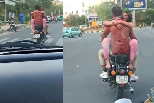 ನ್ಯೂಸ್ ನಾಟೌಟ್:  ಹಲವು ಬಾರಿ ಟ್ರಾಫಿಕ್‌ ನಿಯಮಗಳನ್ನು ಉಲ್ಲಂಘಿಸಿ ಬೈಕ್‌ ನಲ್ಲಿ ಪ್ರೇಮಿಗಳು ಅಪ್ಪಿಕೊಂಡು ಪೊಲೀಸರ ಅಥಿತಿಗಳಾದ ವಿಷಯಗಳು ಆಗಾಗೆ ಸುದ್ದಿಯಾಗುತ್ತಿರುತ್ತವೆ, ಇಂತಹದ್ದೇ ಘಟನೆ ಹೋಳಿ ಸಂಭ್ರಮದ ಜೊತೆ ರಾಜಸ್ಥಾನದಲ್ಲಿ ನಡೆದಿದೆ.